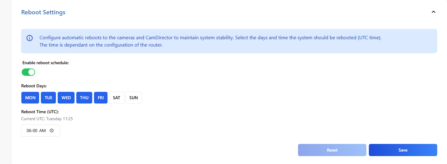 Avonic recommends switching the Voice Tracker on when it is in use and turning it off when it is not needed. For installations where the CamDirector and connected cameras operate continuously, we advise scheduling a daily reboot. At the chosen time of reboot, the CamDirector will first reboot the cameras and after 2 minutes, itself. Take note that the CamDirector time is in UTC.