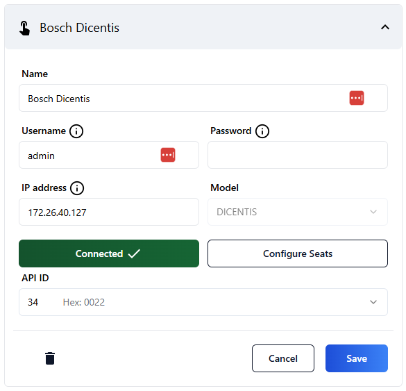 Here you can enter the IP settings and the username/password, and configure the seats.