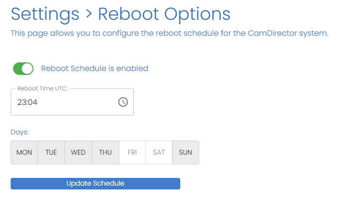 At the chosen time of reboot, the CamDirector will first reboot the cameras and after 5 minutes, itself.